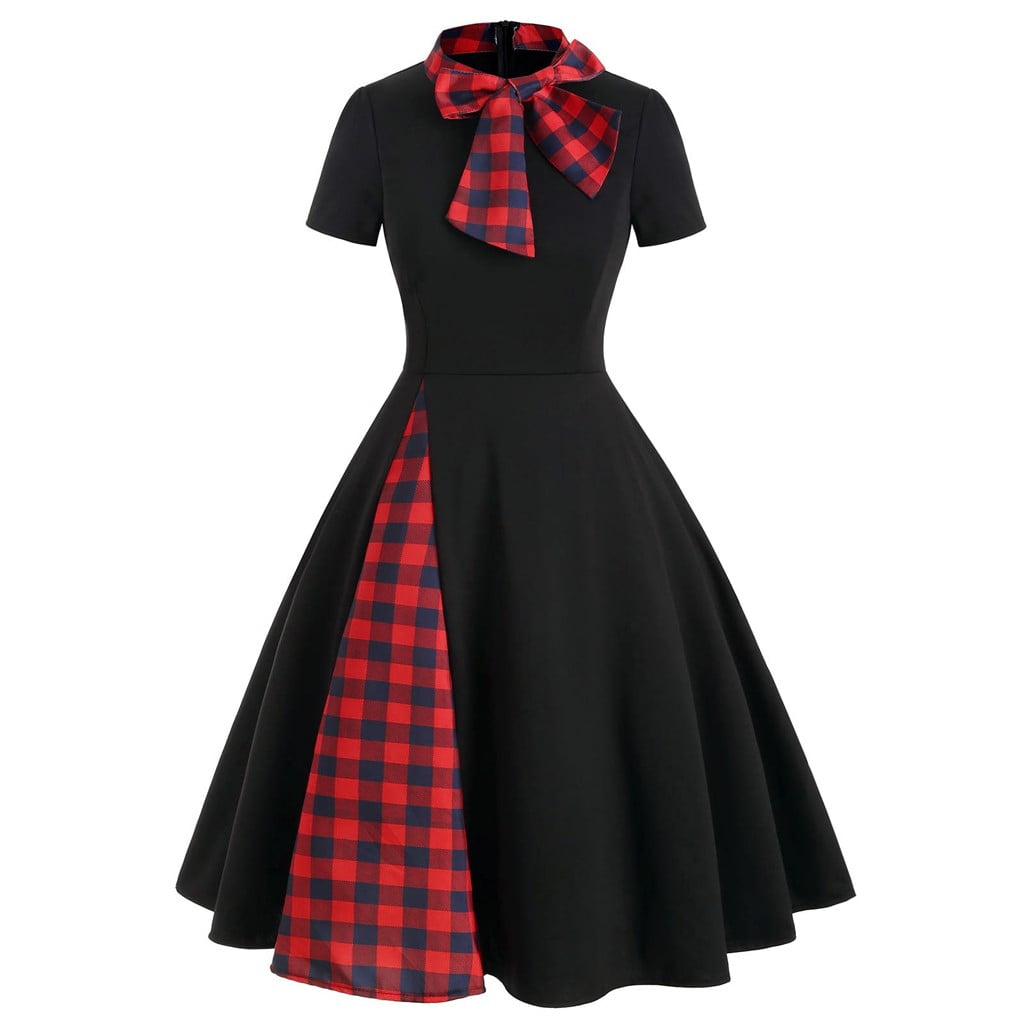 Whlbf Women S Dress Clearance Short Sleeve Plaid Panel Bow Tie Vintage Rockabilly Style A Line Dress Black 6 L Walmart Com